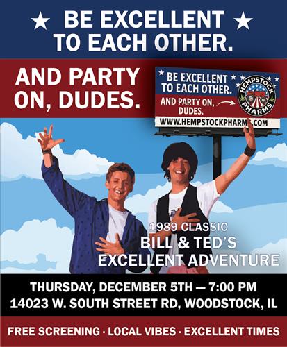 Join us in the barn as we screen the 1989 classic Bill & Ted’s Excellent Adventure at Hempstock Pharms!